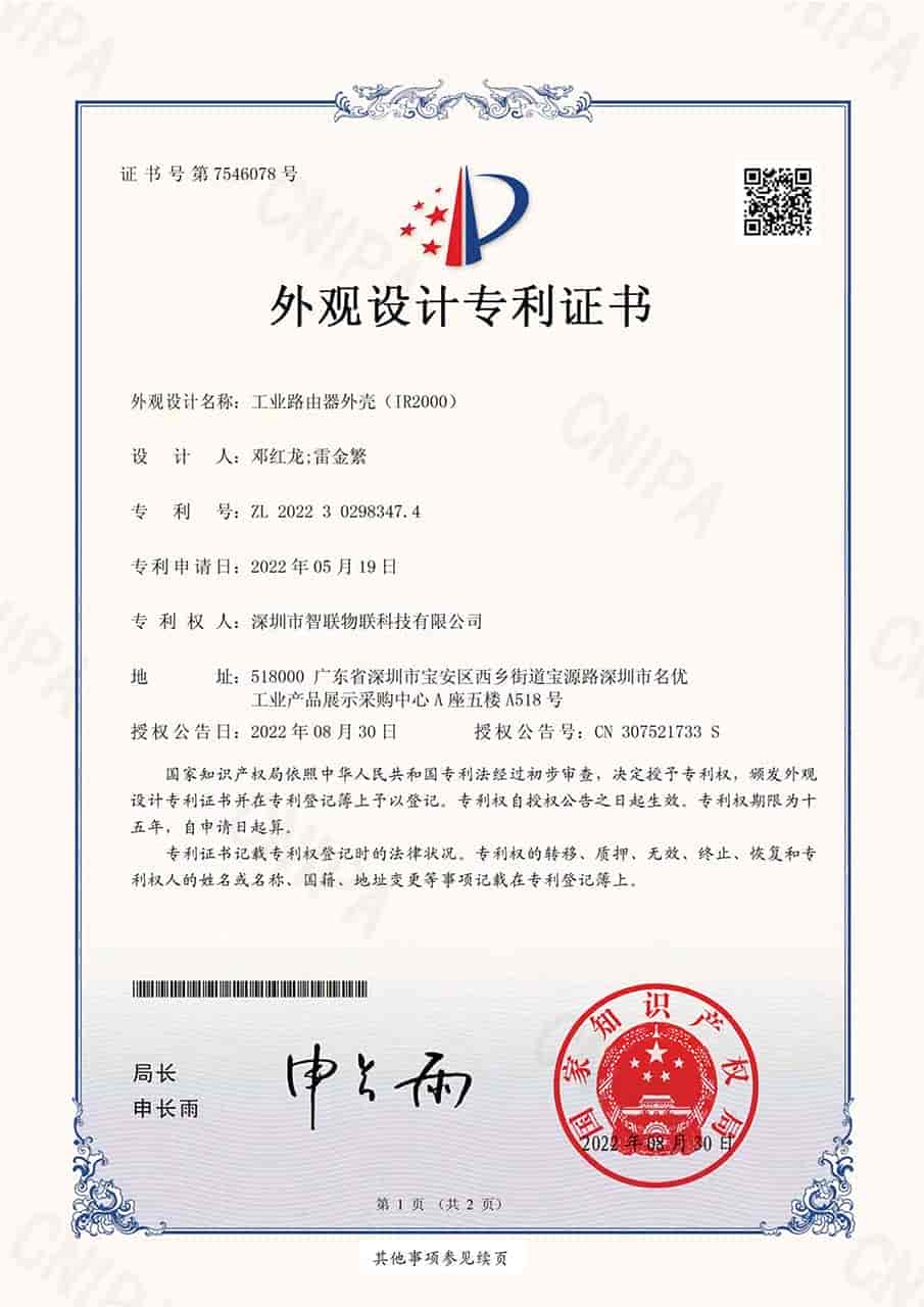 IR2000系列外观设计专利证书