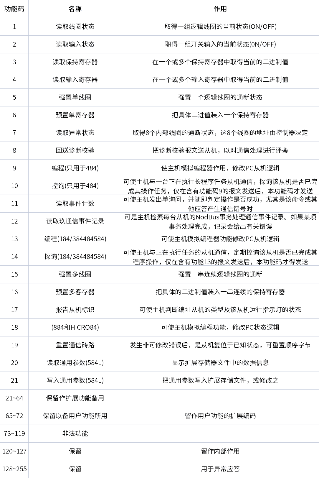 Modbus功能码名称与作用