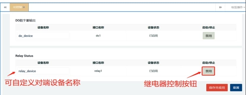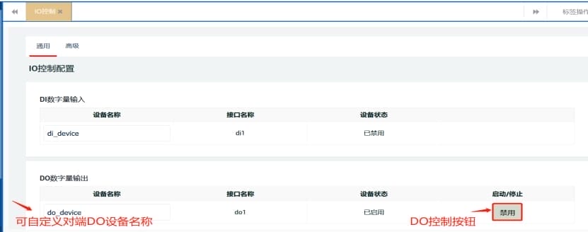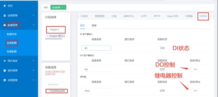 (2)登录云平台后,打开配置管理-设备配置,选择对应的分组和设备,点击IO控制即可进行相关操作,具体功能如下图: