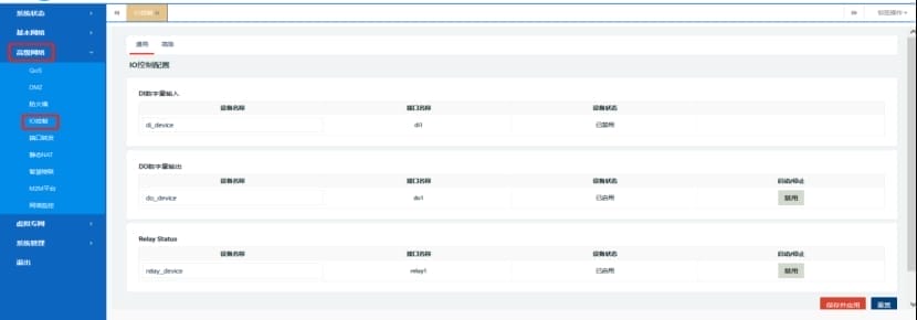 工业路由器IO控制是指路由系统已开发支持对用户DI(数字输入)/DO(数字输出)/Relay(继电器)类型的设备控制操作,目前各支持1路设备类型。 IO控制目前支持2种方式进行控制操作,即通过工业路由器web页面本地IO控制查看及通过工业路由器云平台进行远程控制查看。具体简单介绍如下,以智联物联工业网关IR4000示例。