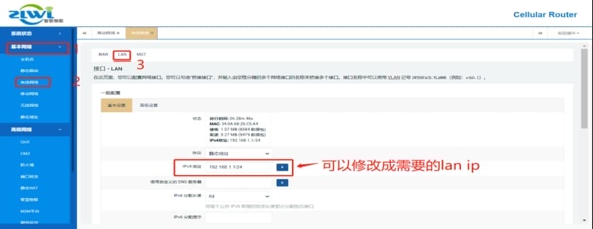 (3)如有需要,还可以修改工业路由器默认网关LAN的IP地址,如下: