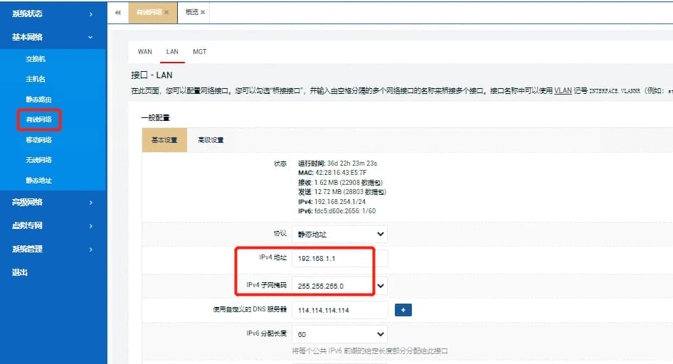 登录路由器web页面后,找到菜单栏“基本网络”--“有线网络”--"LAN",可以修改设备的LAN网口IP地址(默认为192.168.1.1),如图: