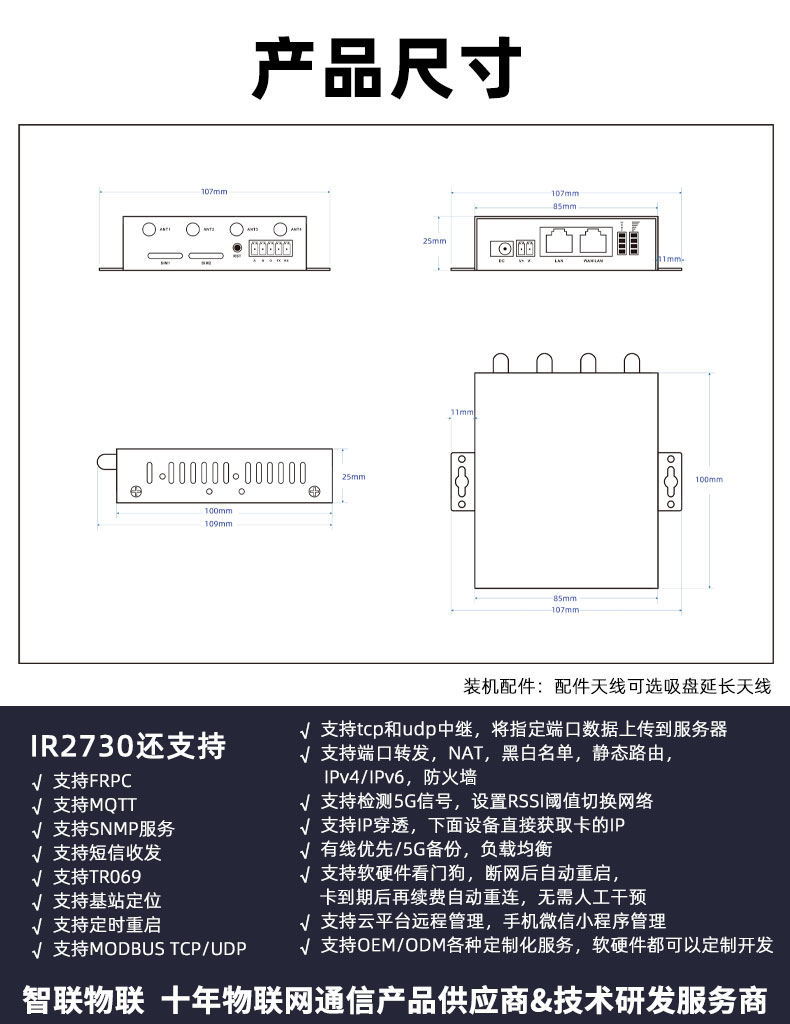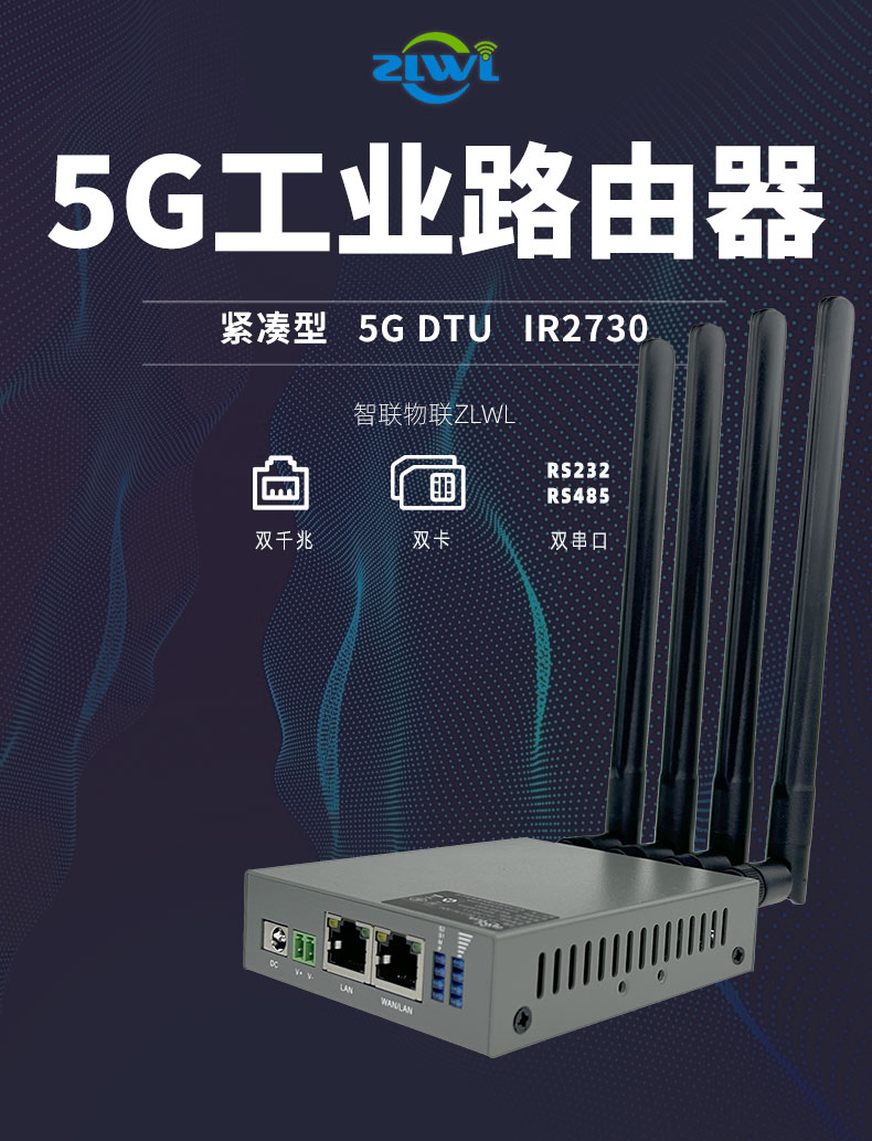 智联物联IR2730是一款高性价比工业5G无线路由器,集成了5GNR、以太网口(1*WAN和1*LAN,WAN可通过配置切换为LAN)、串口(1路RS232和1路RS485)等技术,为用户设备提供高速可靠的互联网连接服务。