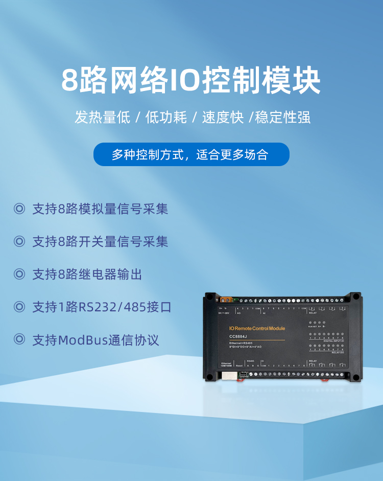 CC8884J是一款支持以太网有线网络交互的远程IO控制模块,可结合智能边缘终端为用户提供长距离数据采集及传输功能;提供8路模拟量信号采集,8路开关量信号采集,可以接各种传感器的模拟信号及开关量信号,8 路继电器输出,可用于外部设备的开关控制;提供1 路RS-232/485接口,可连接各种串口设备,如智能边缘终端、智能控制终端、PLC、单片机、智能仪表等;性能稳定,内置看门狗电路,保障在恶劣环境下也能长期稳定可靠工作;广泛应用于智能交通、门禁系统、考勤系统、工业自动化、智能建筑楼宇、消防、公共安全、数字化医疗、双碳系统等场所。