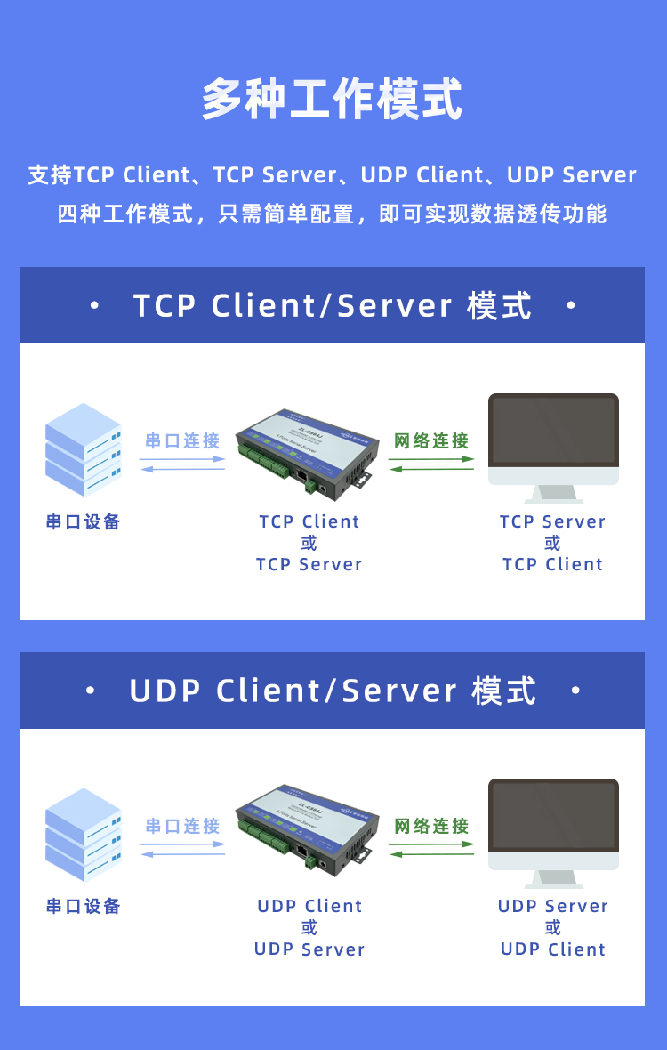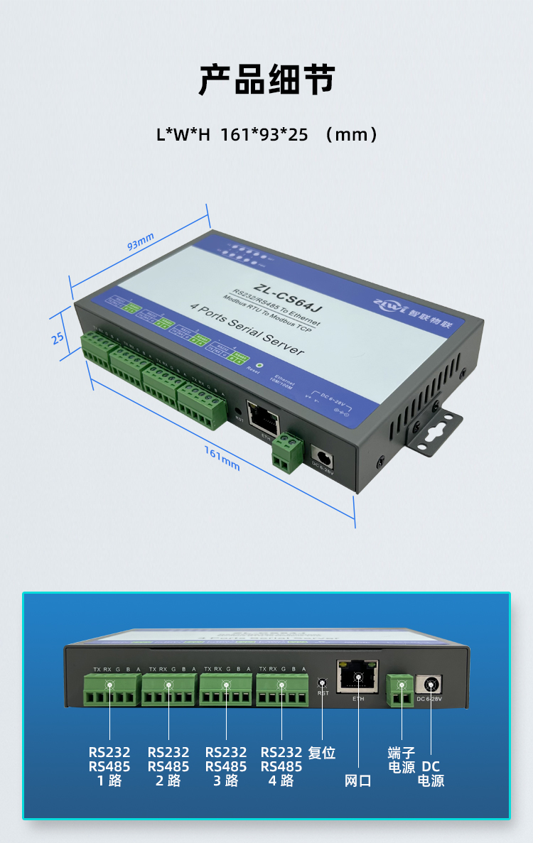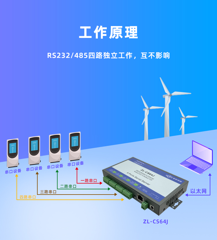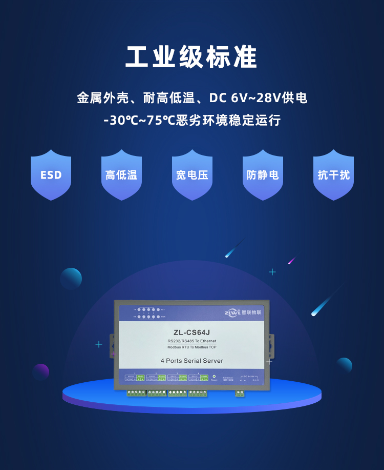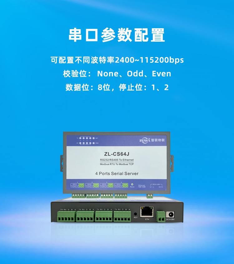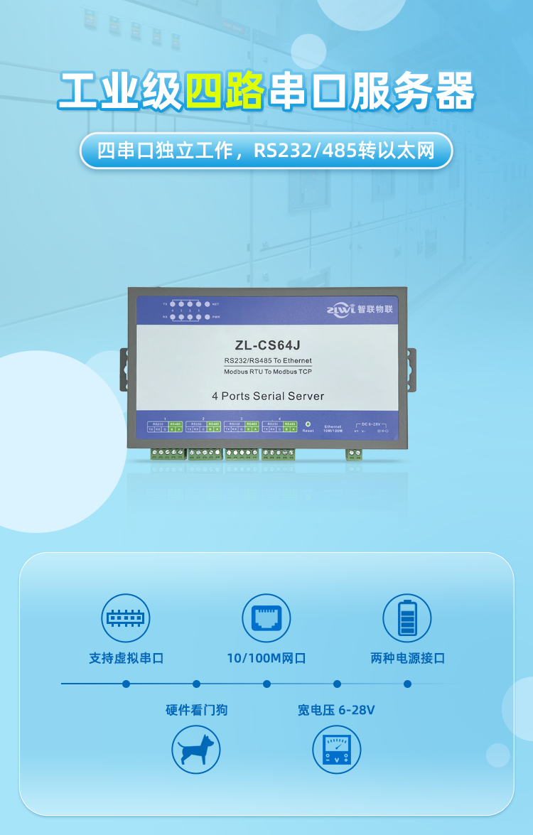 CS64J四串口服务器是一款可快速实现串口和网口之间双向数据传输的设备,所有的数据协议转换全部由产品内部自动处理,用户只需要做简单的配置,即可实现RS232/RS485串口端数据和网络端之间的接收和发送。支持TCP/UDP/Modbus协议,支持动态DHCP和设置静态IP,产品参数可通过内置Web完成配置,简单快捷。产品广泛应用于各行业的解决方案中,如工业现场PLC、智能水务、智慧电力、污水处理、楼宇自控、工业机器人、医疗器械等场景。