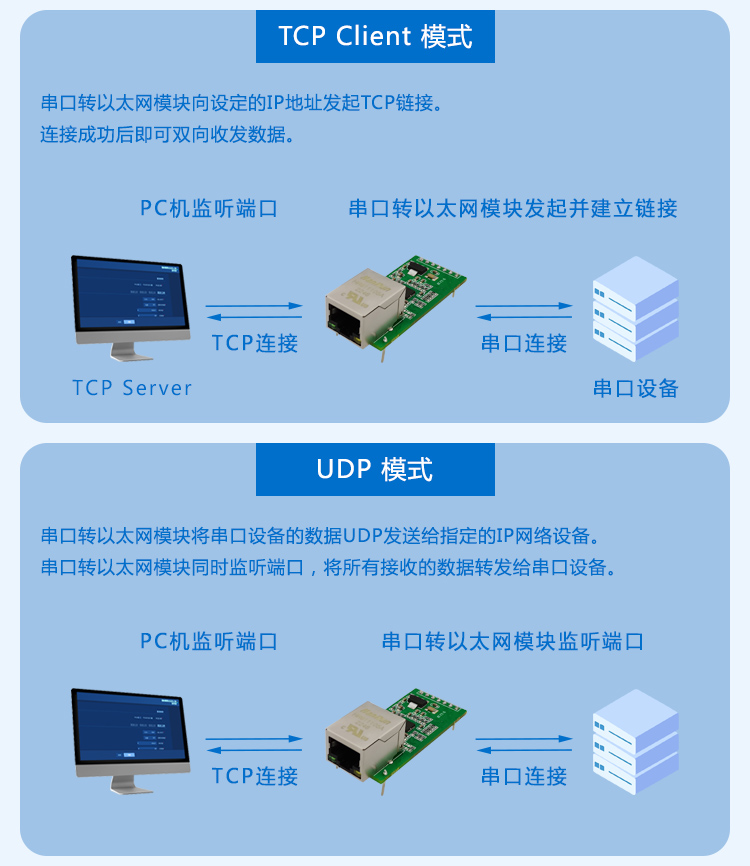 插针式TTL以太网模块(ZS010)是智联物联推出的可快速实现串口和 网口双向数据传输的模块。 所有的数据协议转换全部内部处理,用户只需要简单配置,即可 实现串口端数据到网络端的传送。产品自带通信接口,支持 TCP/UDP 协议,支持 DHCP 和 DNS 功能,产品参数可通过内置 Web 完成配置,简单快捷。 产品稳定可靠,耐高低温,两种封装均可以更快的集成到嵌入式 开发板中,产品在仪器仪表、门禁考勤、智能家居、工控一体机、医 疗器械等应用场景中广泛使用。
