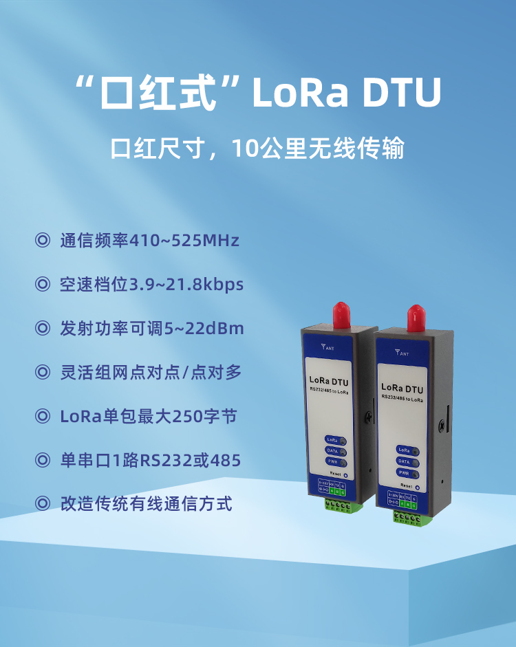 LoRa数传电台CL61M支持多级功率调节,10公里远距离多节点传输,250字节传输,小巧mini机身口红尺寸,支持RS485/232串口,安装可选导轨式或壁挂式安装,适应大多数工业场景安装应用。【10公里远距离传输】【RS232/485】【导轨/挂耳】【73.5*27*18mm】