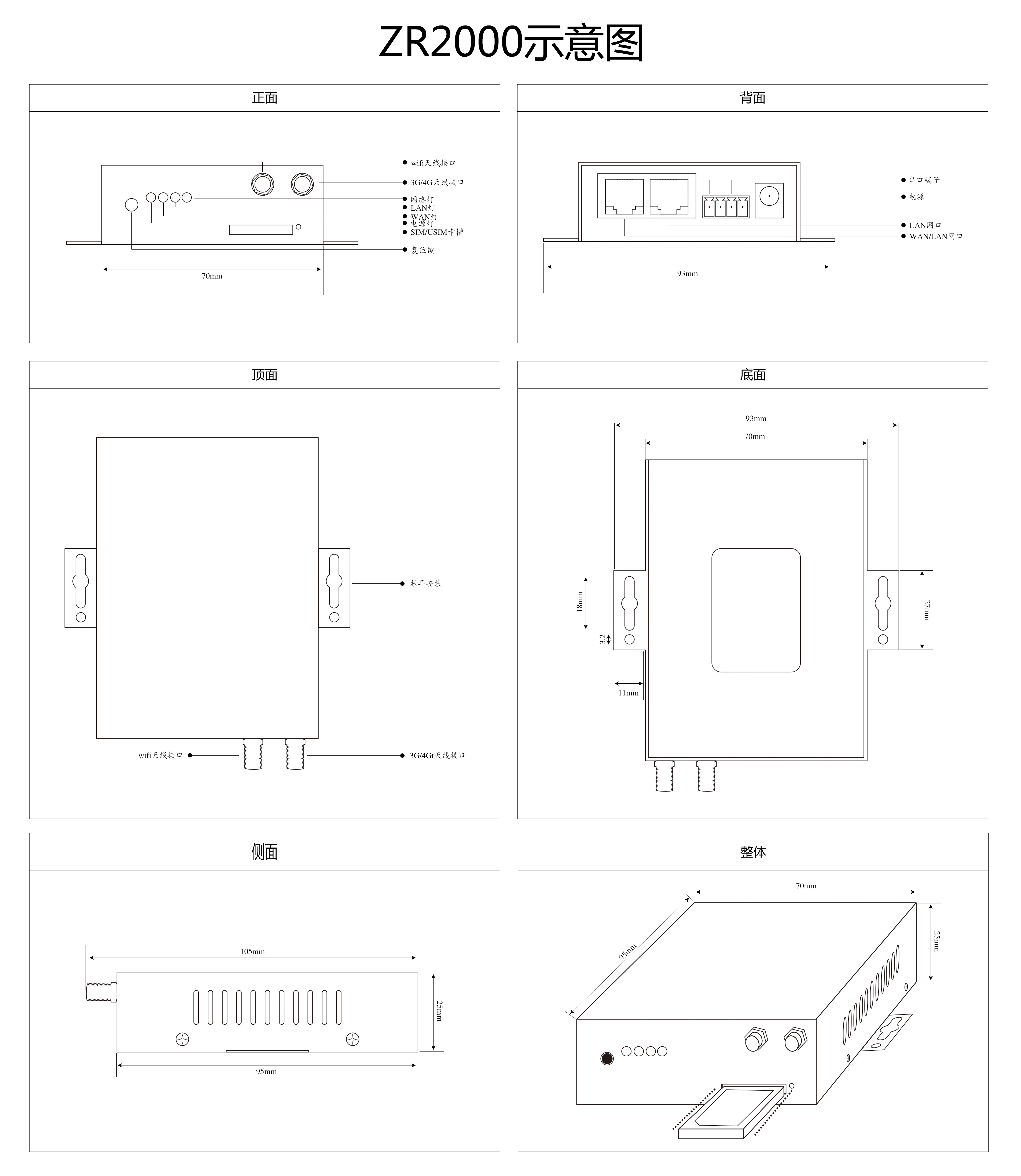 ZR2000系列具有2个百兆网口,1个串口(RS232或RS485),支持2.4G 150Mbps WiFi,是一款功能丰富、应用广泛的4G全网通工业级路由器。