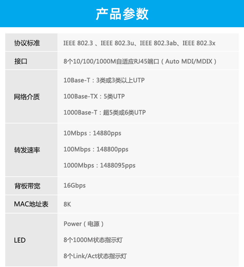 8口千兆企业级交换机,每个端口支持10/100/1000Mbps自动协商,所有端口均支持自动线序交叉功能,线路连接简单,即插即用。该产品将为您提供经济实惠、使用简单、性能良好、无缝连接的1000Mbps全双工数据传输网络服务,专为小型工作组和桌面计算机设计,是您组建经济、稳定、快速网络的理想选择。