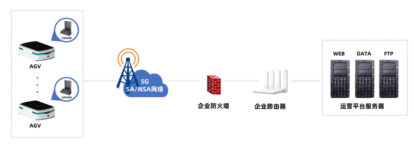 智联物联5G工业路由器和AGV搬运机器人通过以太网RJ45连接,给AGV搬运机器人控制单元提供网络,通过5G网络的超低延时实现厂区全面覆盖;同时AGV搬运机器人通过5G网络实现AGV调度控制系统实时通讯,实现运输速度的灵活变化和运输路线的按需调整。通过AGV调度系统和工厂生产管理系统对接,当生产管理系统有订单时,通过AGV调度系统统一调度厂区AGV搬运机器人智能运转,继而通过激光导航根据系统分配的指令进行智能物料搬运,从而达成系统全自动下单、工厂智能调度的智慧化生产目标。基于5G NSA/SA网络技术,对生产车间进行5G全网覆盖,利用5G网络的超低延时,高带宽和无死角覆盖,给AGV搬运机器人提供高效能网络实时运行,实现工厂信息化、自动化、网络化管理,大大的提高了工厂的生产运营效率及节省了大量经济成本。