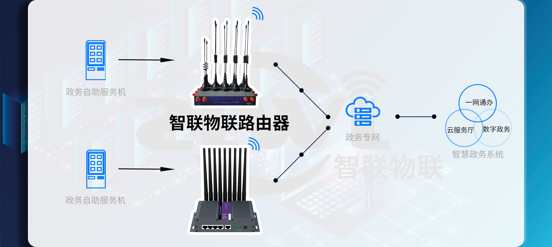 上一个方案:智能快递柜远程管理方案下一个方案:基于工业4G路由器的智能生鲜配送柜系统解决方案随着各省市“智慧政务”、“云上服务厅”项目的建设,数字政务基础设施向基层村镇延伸,电信运营商也在大力发展5G基站,加快基层村镇5G网络的覆盖。在此背景下,政务自助服务终端走出行政服务大厅,大量部署到基层村镇,解决服务群众最后一公里的问题。基层群众通过自助服务终端就可快速办理民政、人社、住建等常规政务服务事项,实现了“办事不出村”、群众“少跑腿”,日常需要接触的政务服务均可即时办结。 自助服务终端下基层,需要解决终端机无线网络通讯、政务数据安全、远程无人值守运维等问题,可在服务终端内配套智联物联工业级5G路由器,实现高速、安全、稳定的无线数据传输。