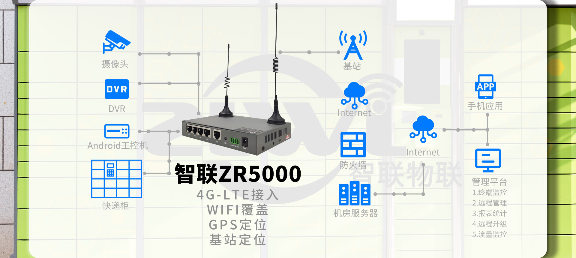 智能快递柜内集成智联物联ZR5000 4G路由器,可支持柜体内多个网络设备同时通过互联网、专线网络连接到云端管理系统,同时还可提供Wifi热点,不需要考虑现场综合布线,可在项目现场灵活扩展副柜,由主柜主机统一管理。