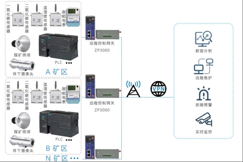随着经济发展煤矿需求不断激增,矿山矿井普遍处于偏远山区,生产管理、人员安全、生产效率是每个矿山矿井都需要考虑的问题,利用网关对现场终端设备连接组网,实现智慧煤矿远程管理。