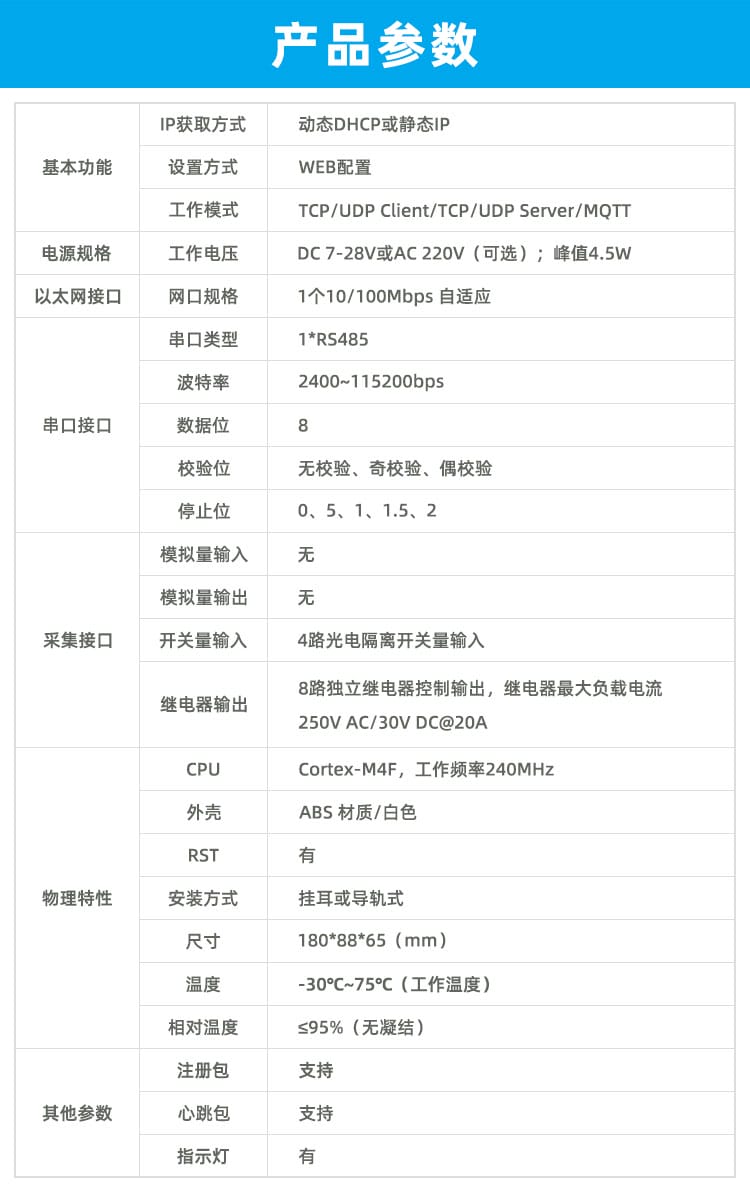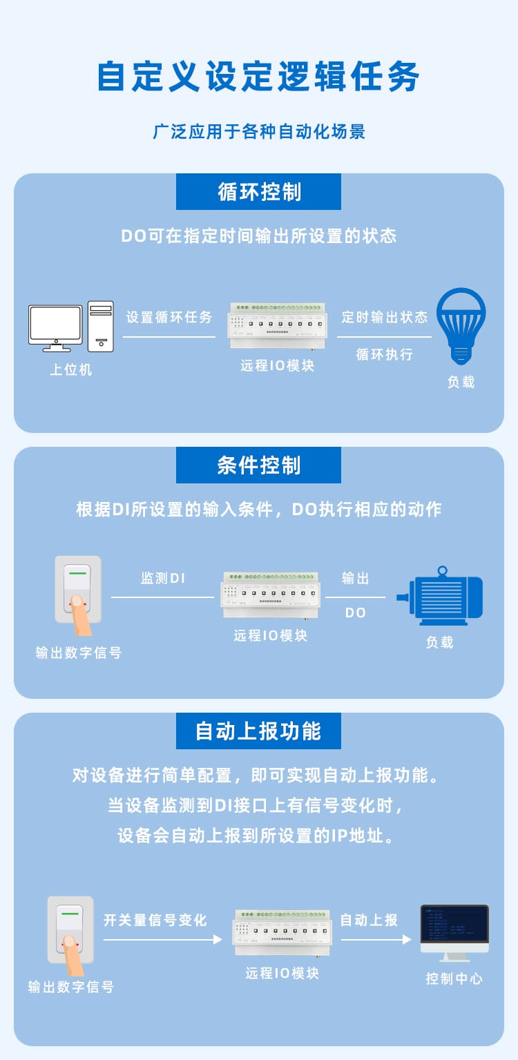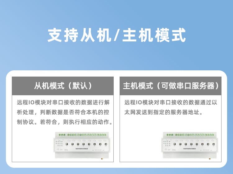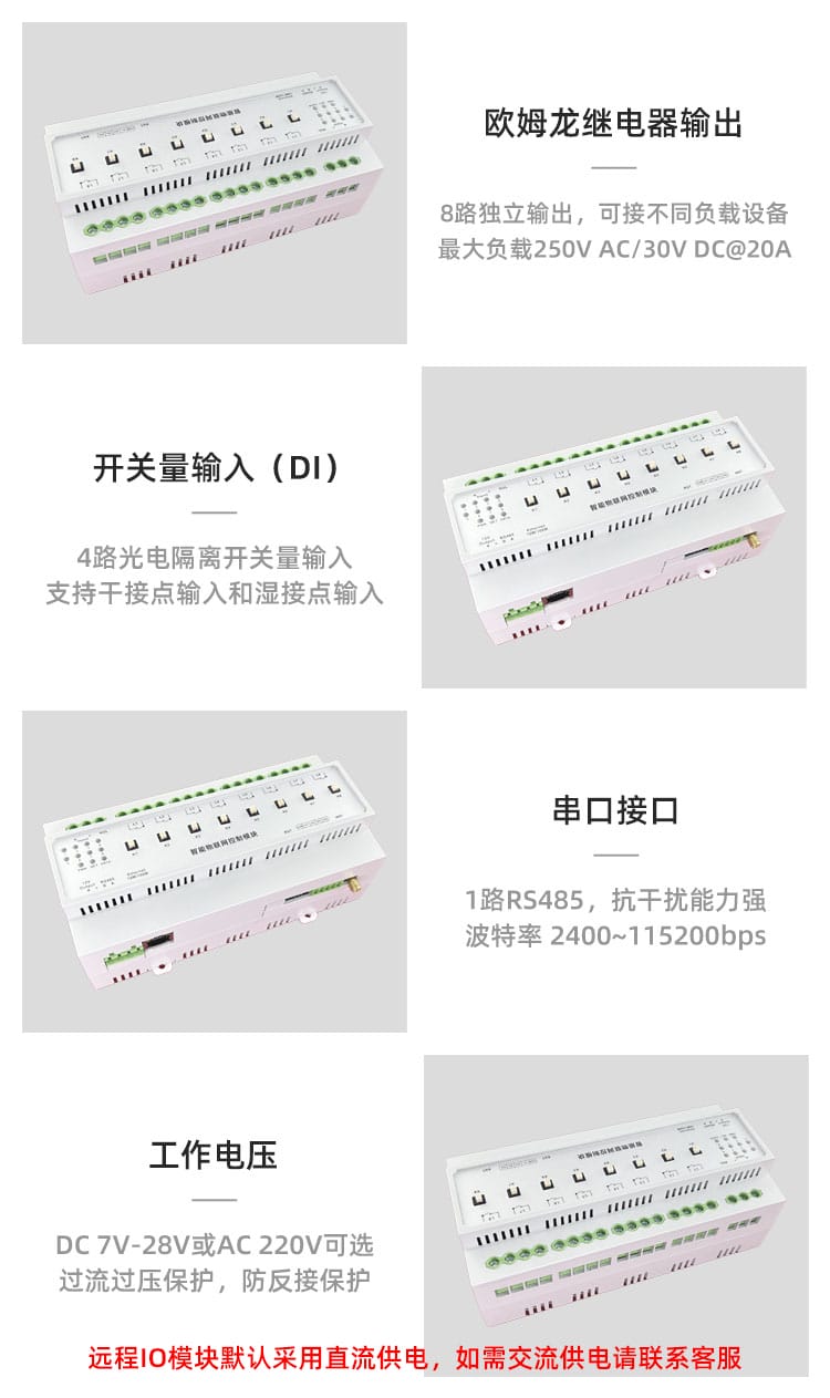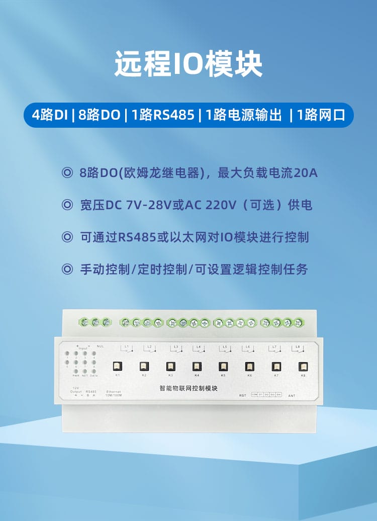 CC4800J远程IO控制模块支持以太网有线网络交互的,可结合智能边缘终端为用户提供长距离数据采集及传输功能;提供4路开关量信号采集,可以接各种传感器的开关量信号,8 路继电器输出,可用于外部设备的开关控制;提供1 路RS-232/485接口,可连接各种串口设备,如智能边缘终端、智能控制终端、PLC、单片机、智能仪表等;性能稳定,内置看门狗电路,保障在恶劣环境下也能长期稳定可靠工作;广泛应用于智能交通、门禁系统、考勤系统、工业自动化、智能建筑楼宇、消防、公共安全、数字化医疗、双碳系统等场所。