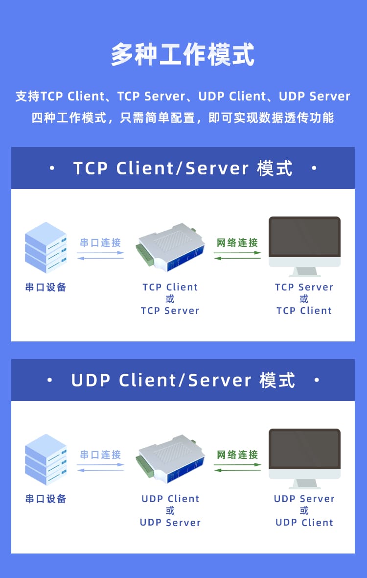 支持TCP Client、TCP Server、UDP Client、UDP Server、MQTT等五种工作模式。