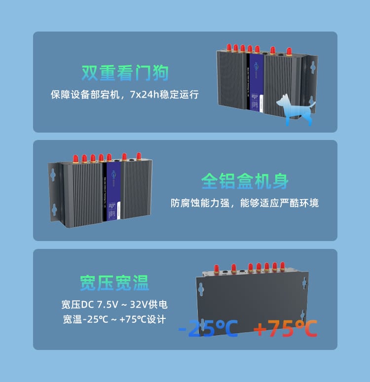 采用软硬件看门狗及多级链路检测机制,具备故障自动检测、自动恢复能力,保证设备在无人值守的情况下也能稳定运行。