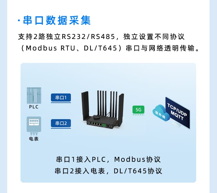 支持串口DTU功能,Modbus/MQTT协议。